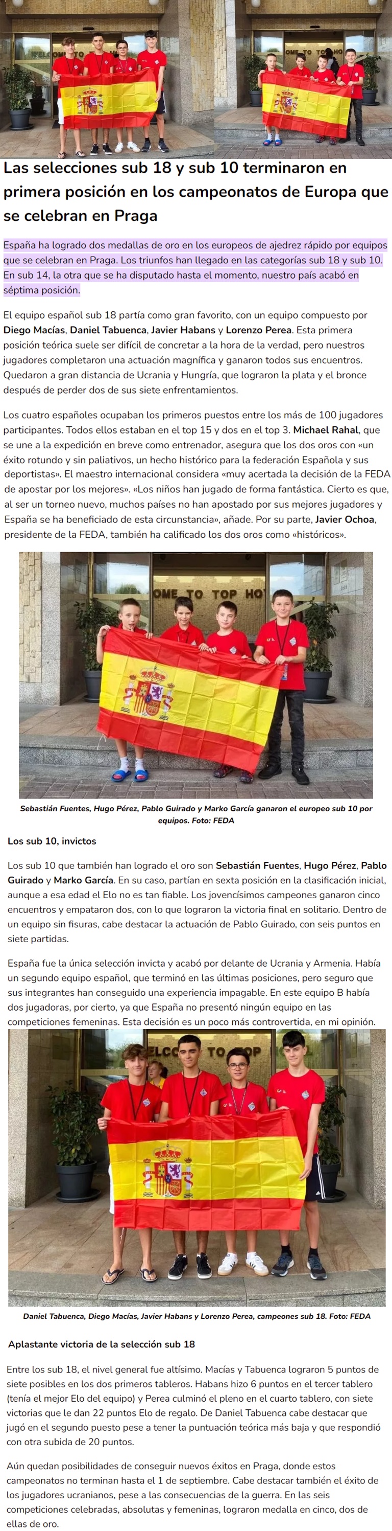 España ha logrado dos medallas de oro en los europeos de ajedrez rápido por equipos que se celebran en Praga. Los triunfos han llegado en las categorías sub 18 y sub 10. En sub 14, la otra que se ha disputado hasta el momento, nuestro país acabó en séptima posición.